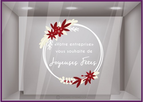 N'oubliez pas de sauvegarder votre personnalisation pour pouvoir l'ajouter au panierCélébrez Noël avec toute votre équipe et vos clients grâce à notre autocollant géant à personnaliser pour votre devanture de commerce de mode. Préparez votre vitrine pour les fêtes de Noël grâce à notre vitrophanie. Créez une décoration inoubliable pour la devanture de votre boutique d’opticien grâce à ce calicot. Ce sticker couronne s’accompagne d’élégantes fleurs rouge vif et rouge bordeaux sur les deux extrémités. On retrouve également sur cette couronne de longues feuilles et du houx dans les tons beige et blanc, puis des branches d’arbre couvertes de neige. A l’intérieur de cette couronne adhésives se trouve un lettrage simple avec un texte à personnaliser avec le nom de votre entreprise. La personnalisation se fait lors de la commande sur le site dans la partie instructions et commentaires. Un joli lettrage manuscrit autocollant “Joyeuses Fêtes” est également présent. Cette vitrophanie sera parfaite pour la vitrine de fin d’année des magasins de décoration, boulanger ou restaurant. Vous pouvez aussi compléter ce sticker avec l’option 10 flocons ronds pour que l’on ait l’impression qu’il neige sur votre devanture de boutique. Notre adhésif est également une super idée décoration pour les boutiques de mode ou de beauté. Pour les opticien ou pharmacie, notre autocollant géant à personnaliser incitera vos passants à venir découvrir votre boutique. Pensez également à nos créations sur mesure ou à compléter votre devanture avec des flocons ou des étoiles pour les fêtes de fins d’années.