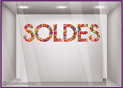 Pour des Soldes fun, il vous suffit coller en vitrine ce sticker bonbons. Voici un lettrage adhésif pour vitres de magasin qui vous permettra de construire votre signalétique de destockage et de braderie. Avec ses lettres autocollantes de couleur vives en impression, cette vitrophanie apportera de la légèreté à votre merchandising. Attirez l’œil sur la devanture de votre commerce avec ce calicot pour bijouterie et magasin de prêt-à-porter. Ce sticker se compose d’un lettrage adhésif Soldes en lettre bâton. L’autocollant géant est en impression avec un motif de bonbons multicolores. Vous pouvez ajouter un pourcentage de réduction jusqu’à -50 % avec nos calicots de promotion. Les lettres autocollantes sont rehaussées d’un liseré blanc, afin de renforcer la visibilité sur les vitres de votre boutique. Après, la nouvelle collection, jouez la carte d’une décoration décalée pour votre période de destockage et de liquidation. N'oubliez pas d'organiser des promotions et ventes privées en amont. Pendant les Soldes, videz vos stocks avec cette vitrophanie amusante et colorée pour enseigne de magasin. Profitez de cette idée décoration pour construire une vitrine au merchandising fun dans votre boutique de jouets.